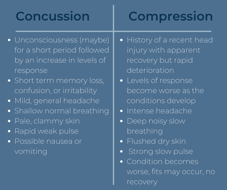 After any blow to the head, the casualty should be monitored for a period of time with medical assistance being requested if you are in any doubt as to the seriousness of the condition. Immediate medical assistance is always required for a suspected Compression.