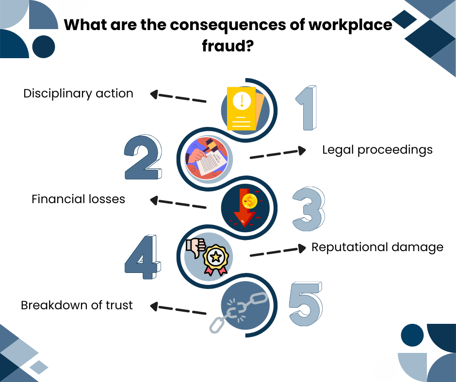 Consequences for workplace fraud can vary depending on severity, they can be levied against an individual or an organisation. They can range from disciplinary action such as a written warning or immediate dismissal for the individual concerned, to legal proceedings for both the individual and the organisation.
