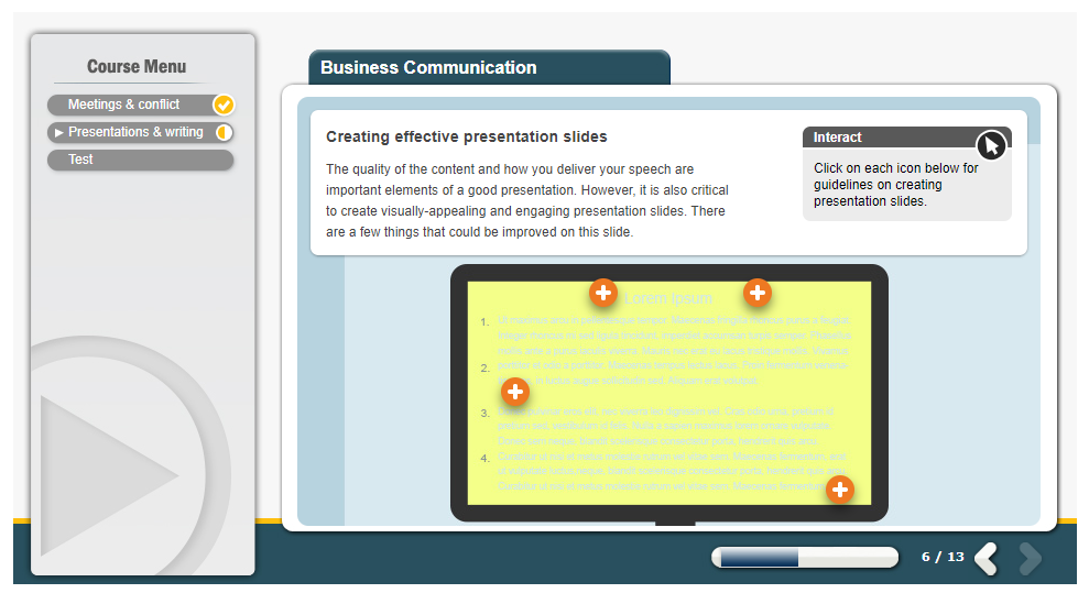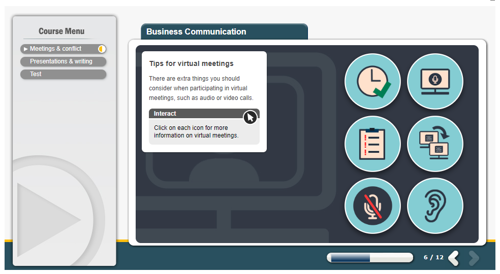 The Business Communication skills course provides advice on written communication, such as emails, as well as for virtual meetings via voice or video conferencing. This Business Communication course assumes a basic understanding of nonverbal communication skills (see our Communication Skills course for more details), and builds on this to discuss emotional intelligence, persuasion and conflict resolution. The course also describes how to prepare for a presentation so you can most effectively communicate your message to an audience.