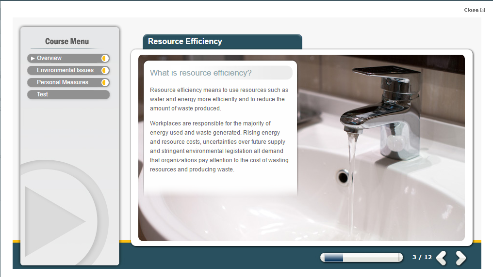 There are a number of effective and simple actions employees can carry out that have a significant impact on an organisation’s use of resources. The first step is to understand the way an organisation uses resources. Building a clear picture of the direct costs of waste, energy, transport and water means that you can create a baseline against which success can be measured. The next stage is to consider the indirect costs of resource consumption. Waste, for example, has a number of ‘invisible’ costs that might not be part of your initial calculation. Our eLearning Environmental Awareness course covers:-