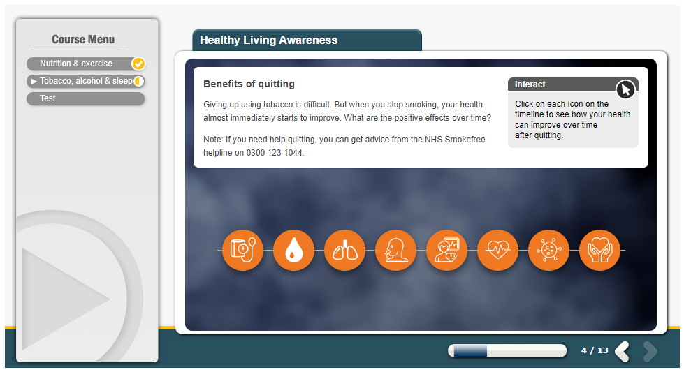 The Healthy Living Awareness online training course is suitable for any employee in any type of organisation who would like to learn more about living a healthy lifestyle, how to apply healthy habits to their own everyday life despite workload and time constraints and what the benefits will be. From a business perspective, it is important to support a healthier workforce, this can result in fewer sick days and the associated costs and increased productivity.