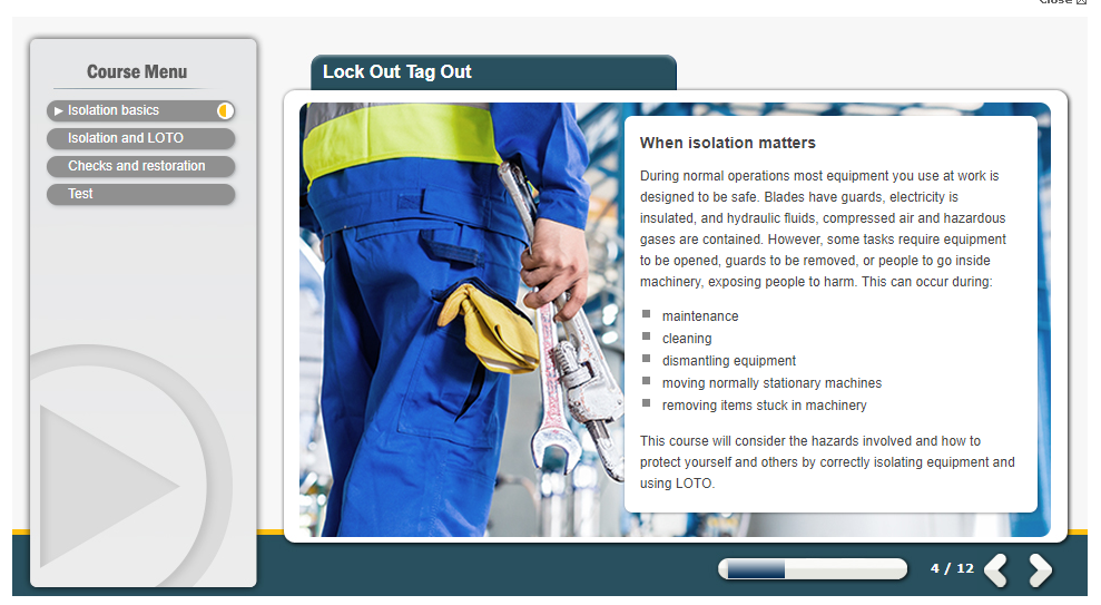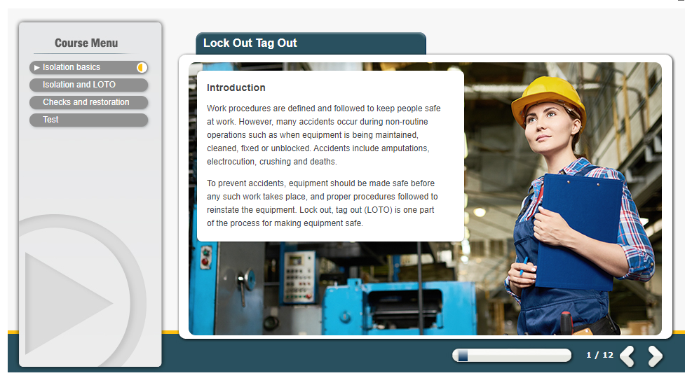Where the lock out, tag out procedure is a significant element of an individual’s job role, it is recommended that this course is used as part of a blended learning approach, for example as preparation for a skills-based practical course or as a refresher of the key points.