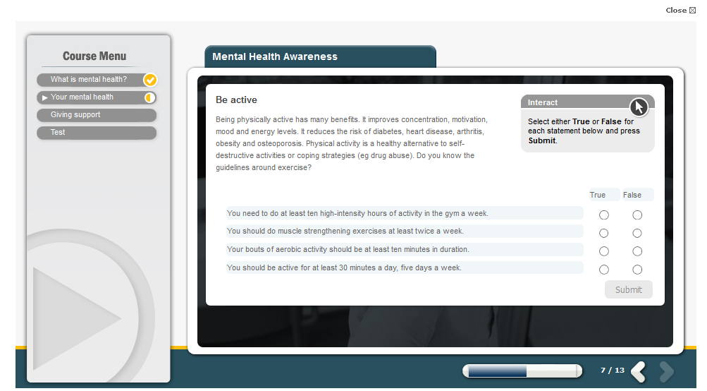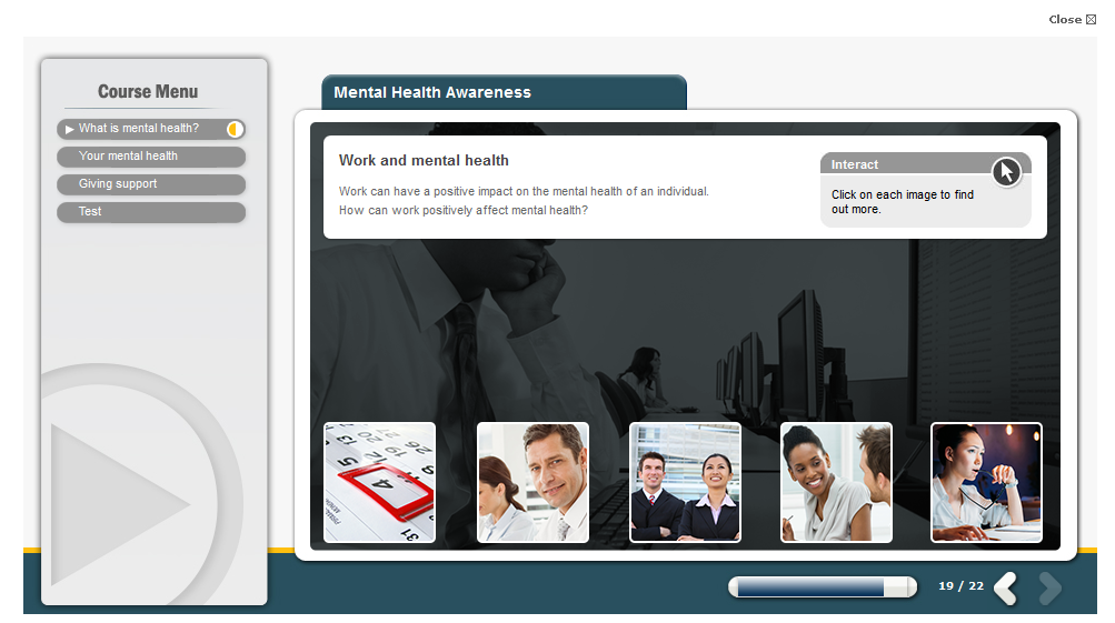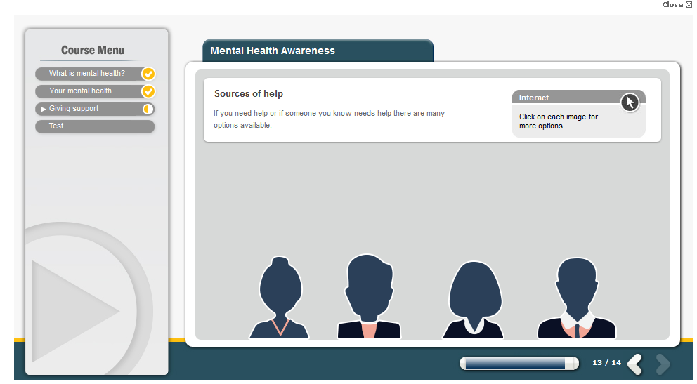 This online Mental Health Awareness Training Course outlines what mental health is and the factors that can cause or prevent poor mental health. It provides strategies that help you maintain good mental health and how to help others who are living with mental illness.