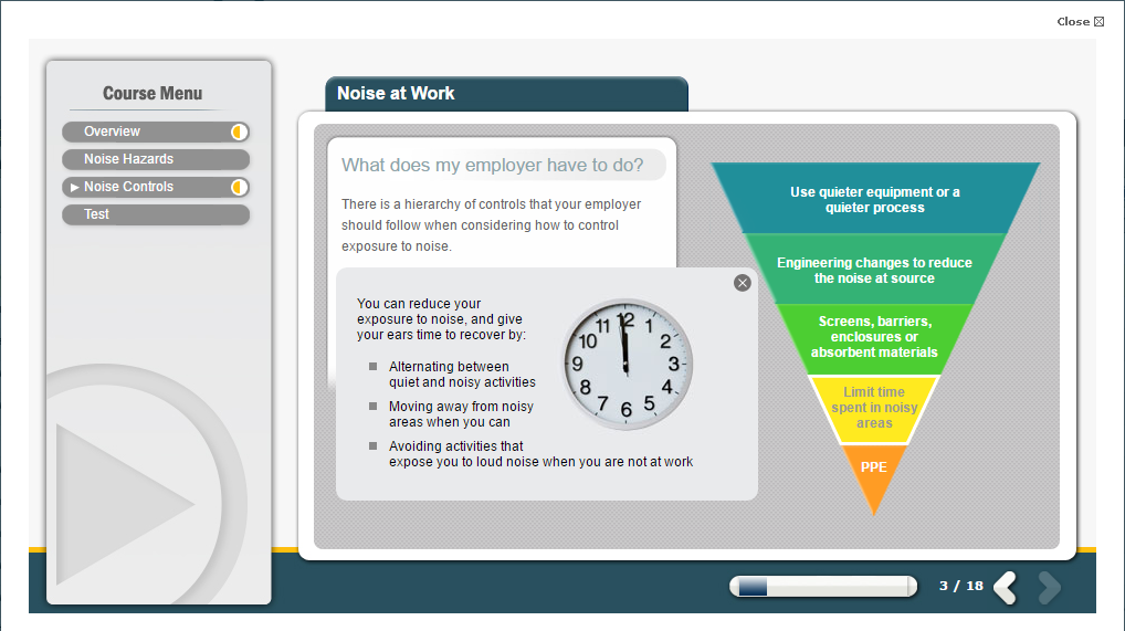Hearing loss caused by workplace noise is preventable. However, once hearing has gone it does not come back. This Noise at Work eLearning Course provides:
