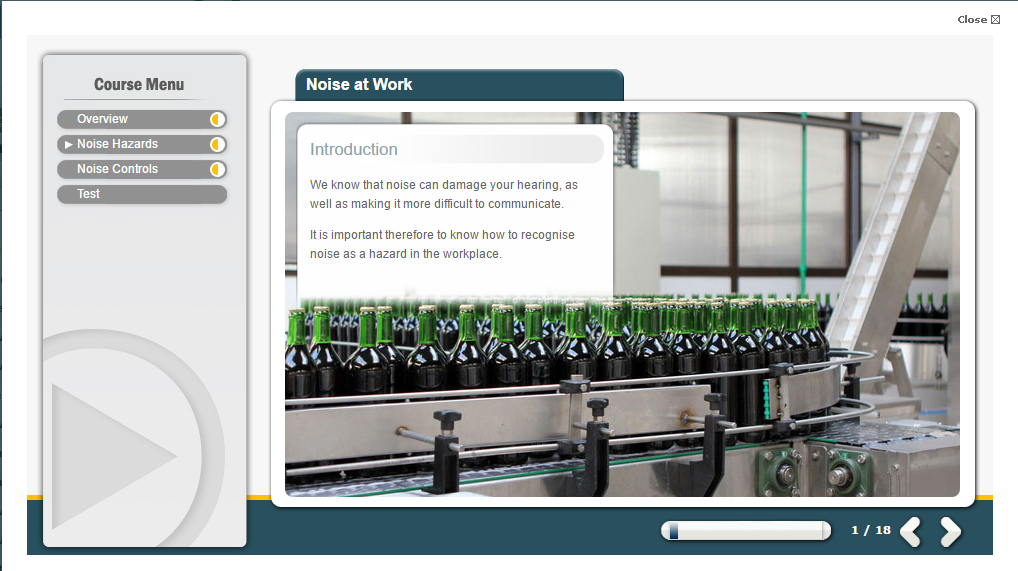 This Online Noise at Work course is appropriate for all employers and employees who work in a noisy environment or with noisy equipment and is designed to raise awareness of the risks associated with noise in the workplace. This course is also suitable as part of a new starter health and safety induction. Please Note This e-learning course only provides awareness education. A full workplace Noise Risk Assessment should be carried out with a calibrated noise metre.   If you are interested in this, check out our DSE Online Training Course as well!