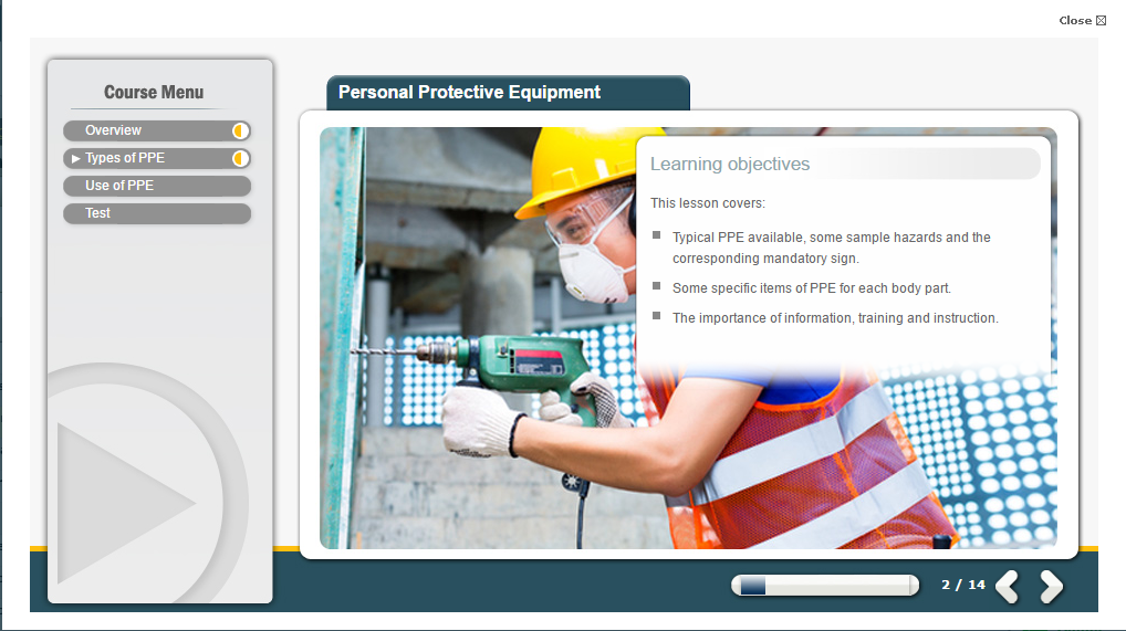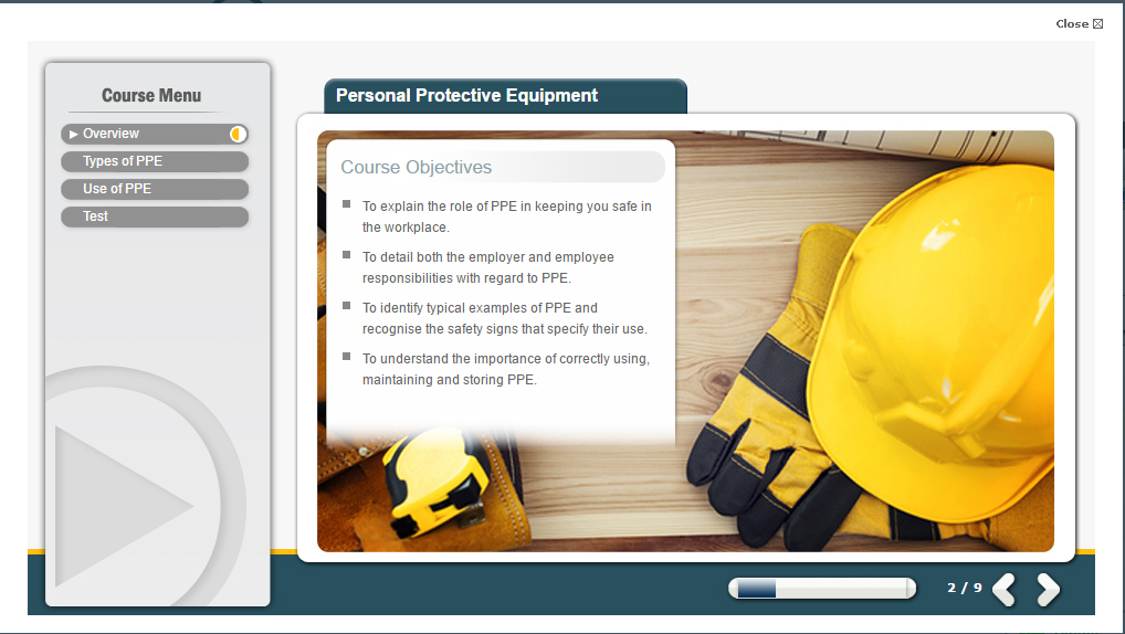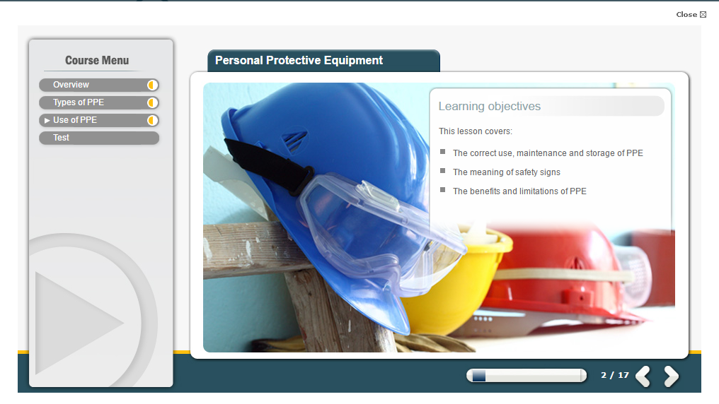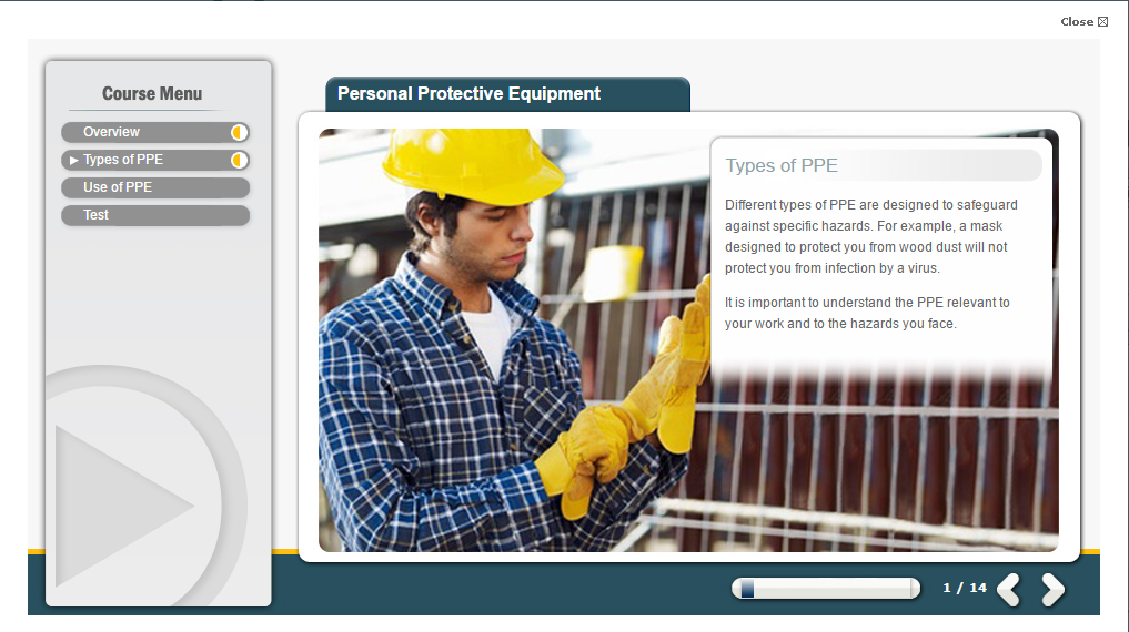 To reinforce learning, the course includes a short assessment. The multiple choice test at the end of the training ensures learners have understood the material. Set pass marks are in place, and a pass percentage is required to achieve the PPE training certificate. Participants who meet the pass marks will be able to download and reprint certificates as proof of completion.