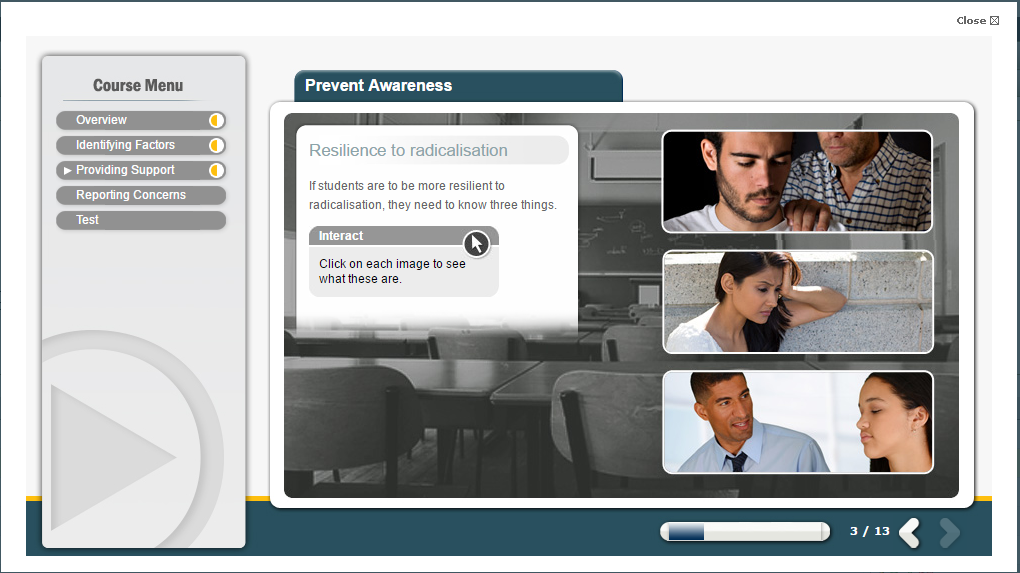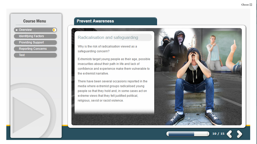 The online Prevent Duty Training outlines the key responsibilities under the Prevent Duty and provides awareness training on how to help safeguard individuals from extremism. The course explains what extremism and radicalisation are, and how to identify children and young people who might be vulnerable. It also explores related issues, including freedom of speech. The topics covered include: