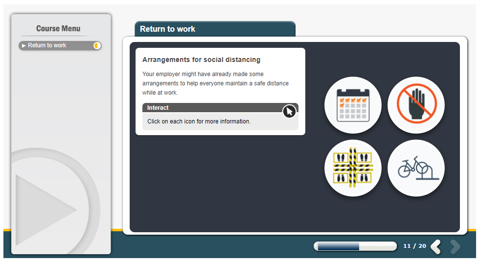 The course provides guidelines and actions to mitigate Covid-19 related risks when returning to work.