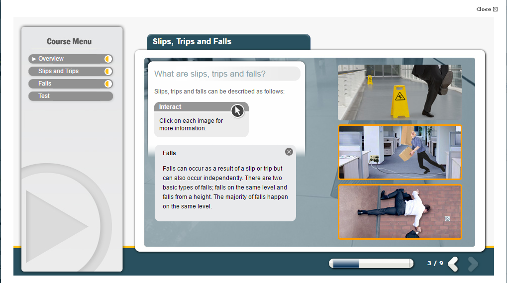 Employees have a duty to take care of their own health and safety and that of others. They must use any safety equipment provided to reduce the risk of slips and trips in the workplace. This Slips, Trips, and Falls eLearning course provides essential information on how slips, trips and falls occur in the workplace and identifies common hazards that can cause accidents.