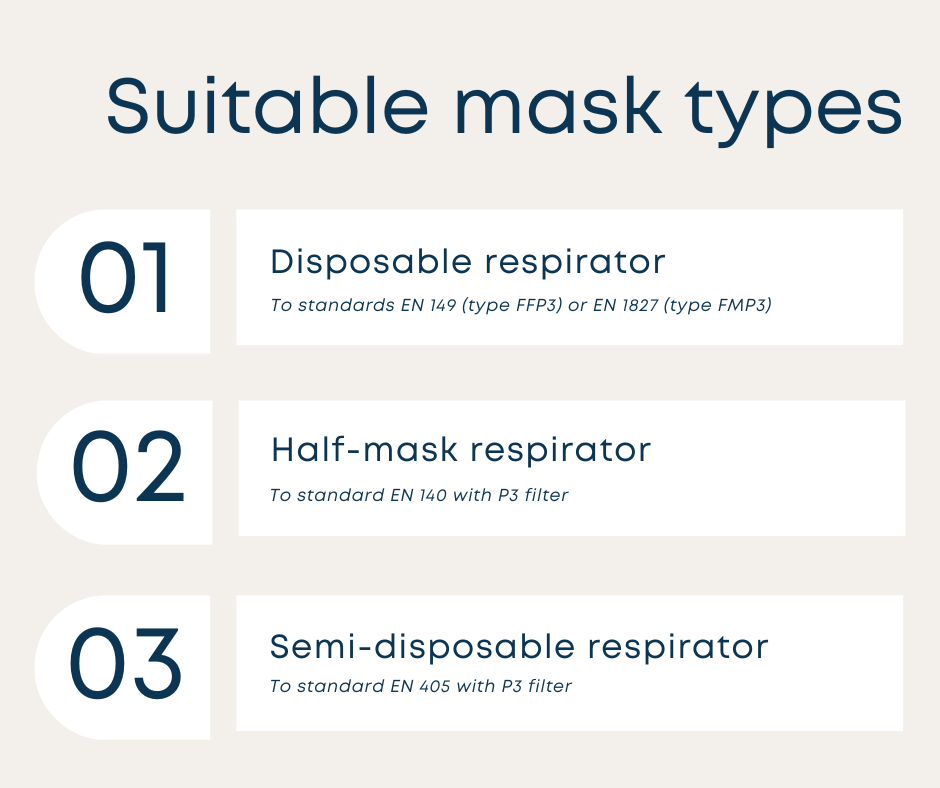 - Half-mask respirator (to standard EN 140) with P3 filter.