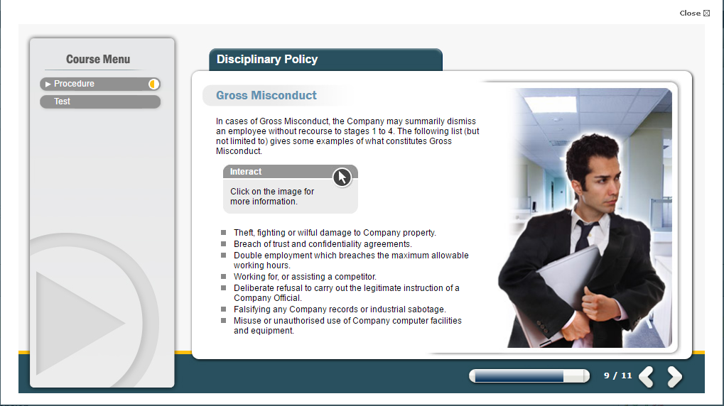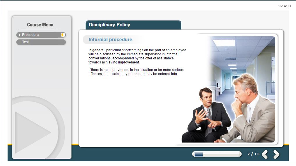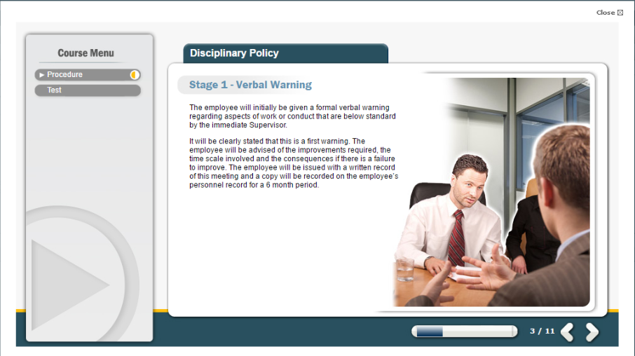 This disciplinary and grievance training is aimed at all employees to educate them on your organisation’s grievance policy as well as explaining the basis for disciplinary action and the range of penalties that can be imposed and procedures of appeal.