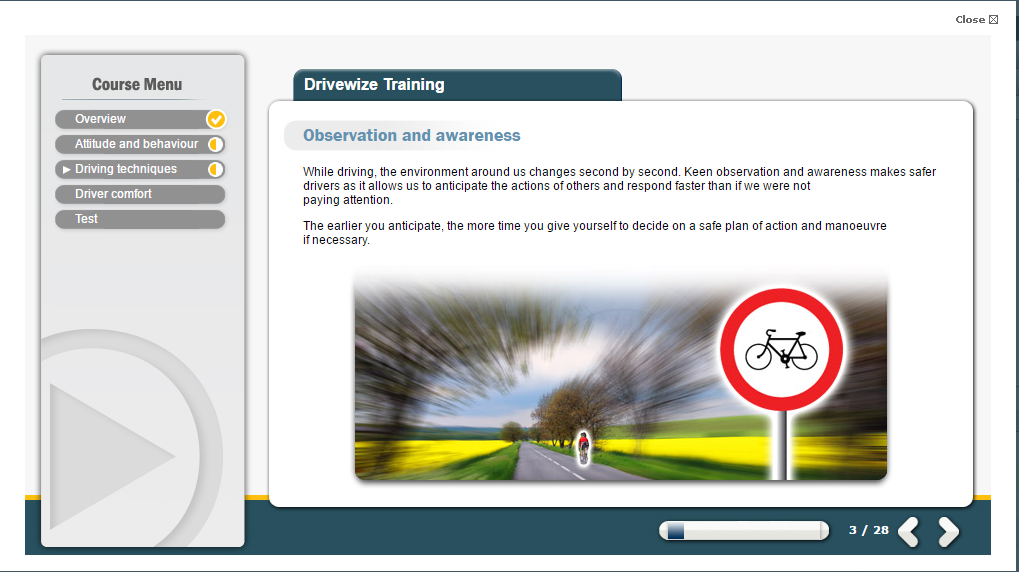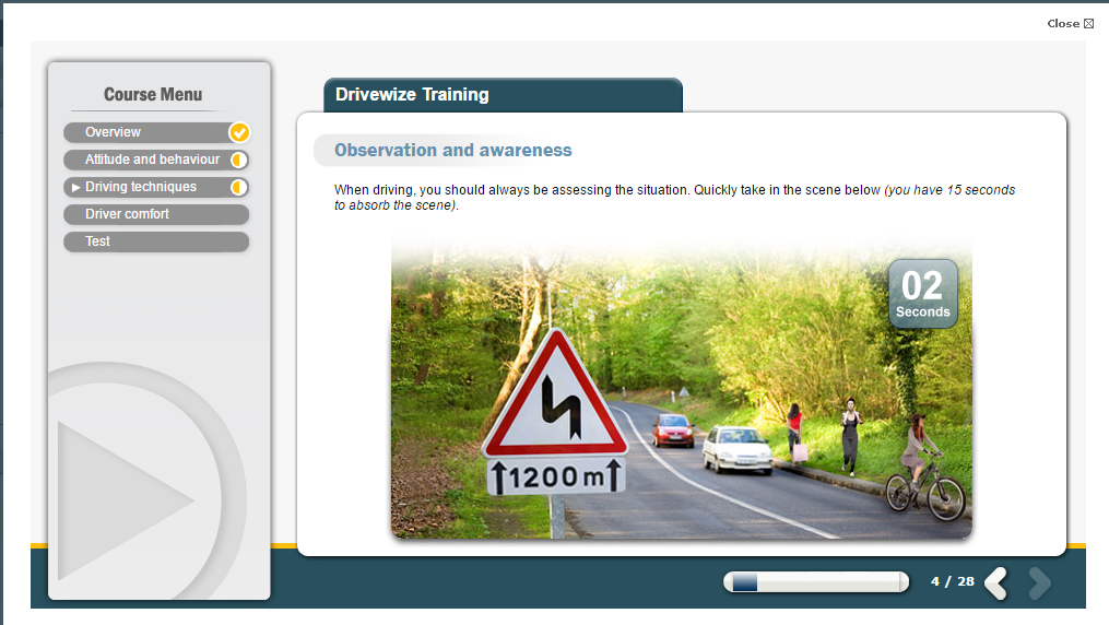 This driver safety awareness course is of benefit to any individuals who drive within the UK as part of their job. The course allows users to evaluate themselves on their driving skills as well as providing them valuable information on vehicle maintenance and driving technique.