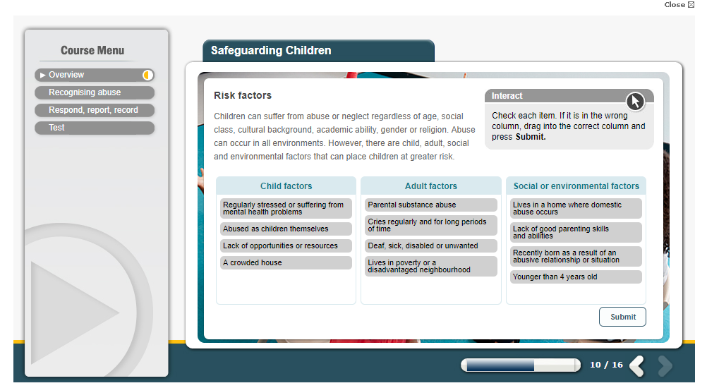 All employees in an organisation have a responsibility under the Safeguarding process to identify and report suspected instances of abuse. However, this online Safeguarding Children course is particularly appropriate for individuals whose job role involves working with children, whether on a full-time, part-time or volunteer basis.