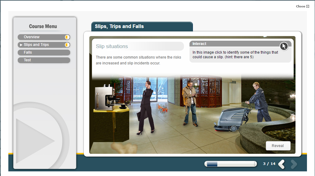 This Slips, Trips, and Falls eLearning course provides essential information on how slips, trips and falls occur in the workplace. It identifies common hazards that can cause accidents, explains maintenance of good housekeeping procedures and describes the importance of accident prevention.